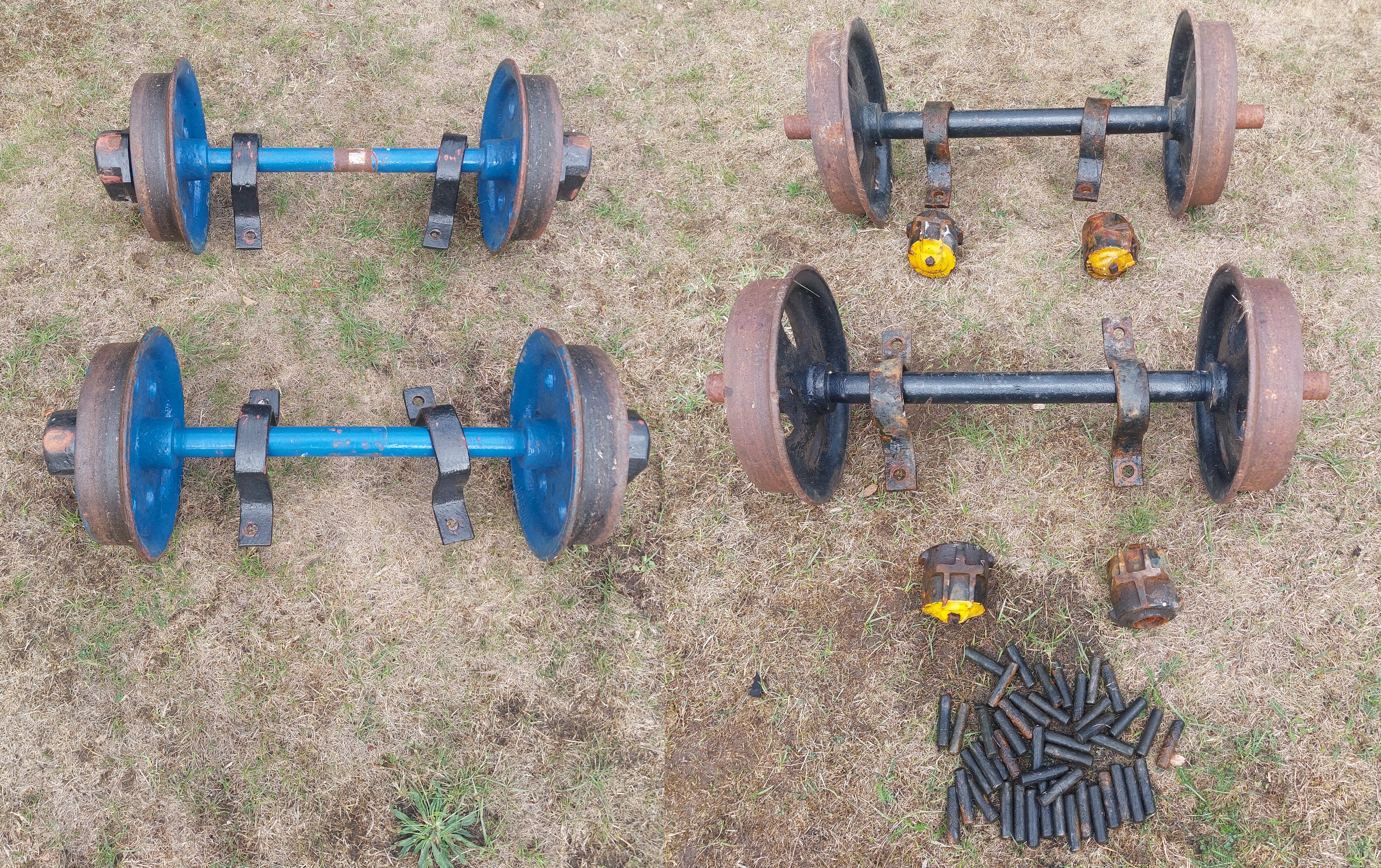 2ft gauge Wheelsets for saleThese are 3 sets of 4 wheels on 2 axles for sale. All are standard Hudson wheels that have been retro fitted with Dodge roller bearings (The photo shows 2 of the 3 sets avaiable). One bearing in each set is broken, but a spare bearing will be included in the sale. The wheel sets are priced at SOLD per set of 2 axles. A further 2 spare Dodge bearings are available at SOLD each and a new unused bearing at SOLD. The location is Peeblesshire, Scottish borders. For more information contact Jim on the email opposite (Click on the image for a larger version). SOLD (Posted: April 2025) |