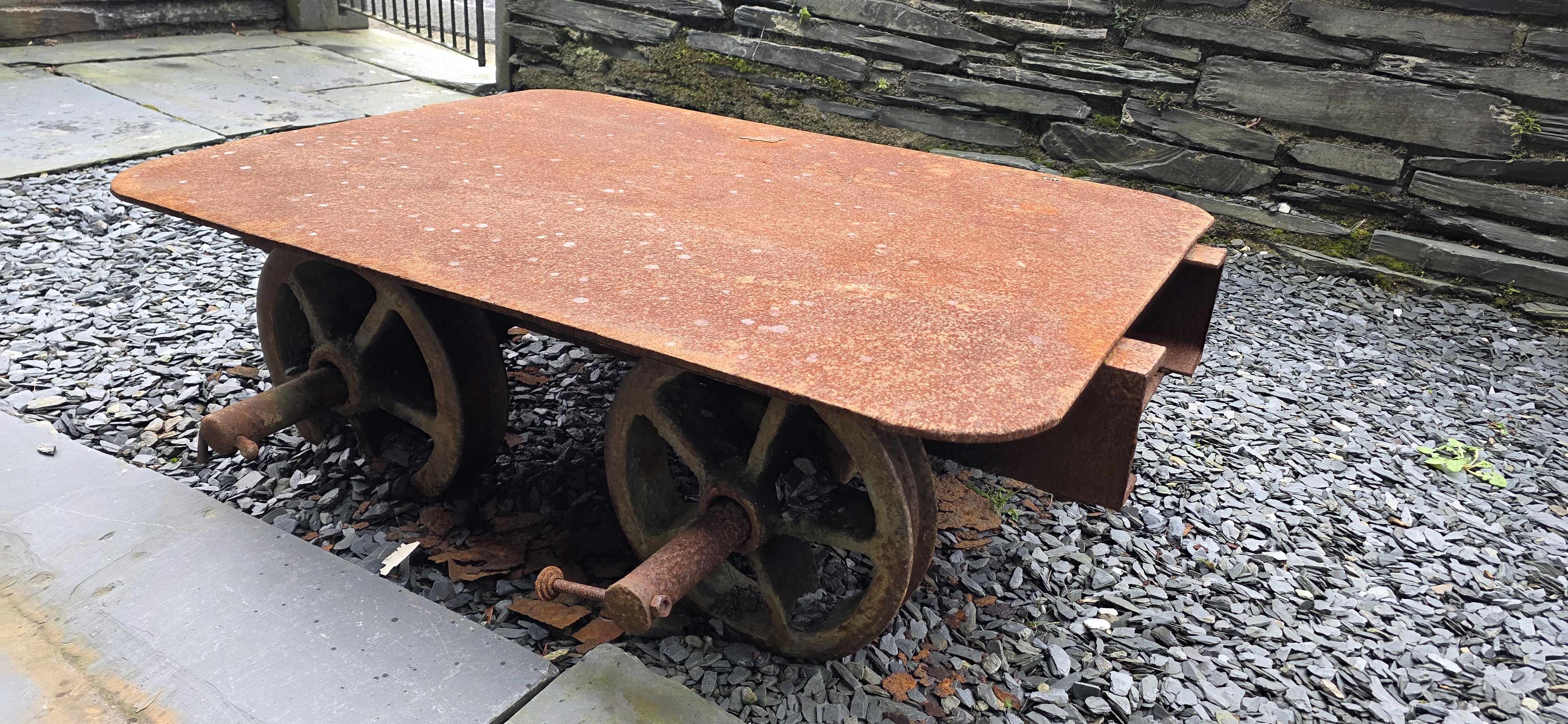 FOR SALE: Slab wagobA double flanged slate slab wagon is for sale. It was reported to have been built at the Brittania Foundry, Porthmadog, and was possibly used at Llechwedd Quarry. The wheels are free on the axles so the gauge is flexible. Asking price is £450.00. Buy collects for Blaenau Ffestiniog. For further information or photos please email Garry on the email address opposite (Click on the image for a larger version). (Posted: February 2026) |