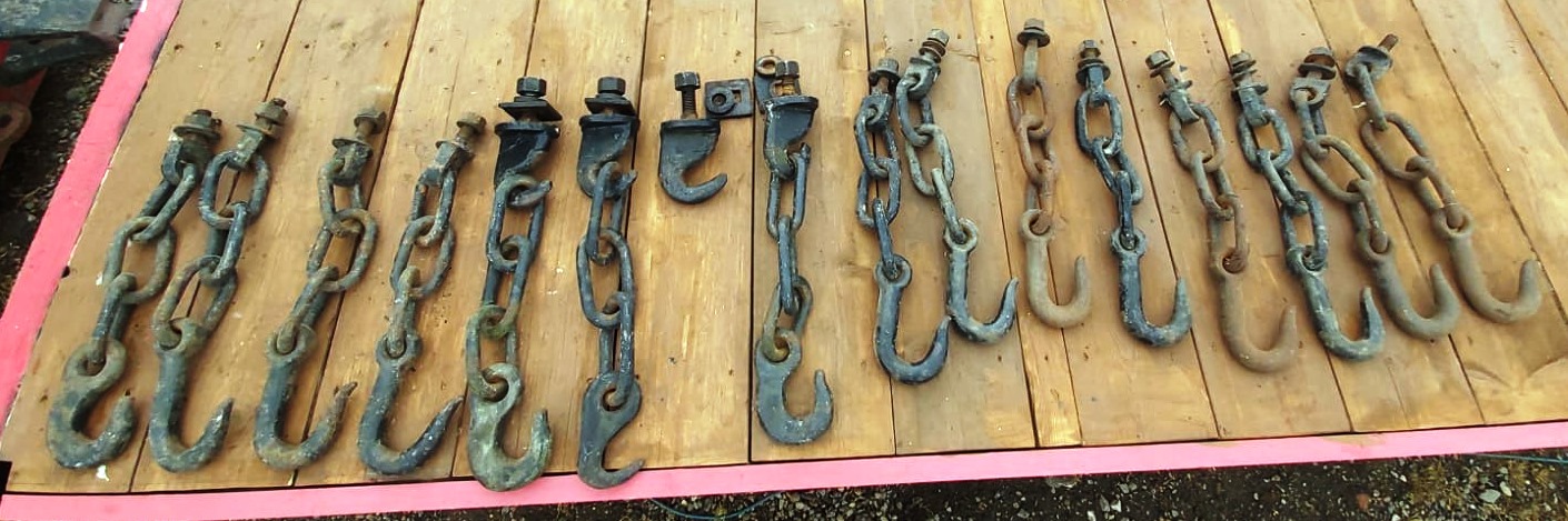 FOR SALE: RNAD Wagon chains.Several sets of RNAD wagon safety chains, complete. There are 3 sets of 4 plus some odds. Each set of 4 is SOLD. The entire lot as in photo is £400 ono. Sold as seen - but all nuts and threads are OK. Buyer to collect from East Suffolk. For more information contact James on the email opposite.(Click on the image for a larger version). SOLD (Posted: January 2025) |