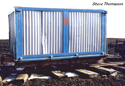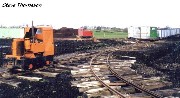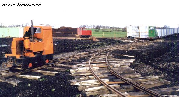 One of those rare occassions when a narrow gauge railway has taken over from road transport. Cladence moss is a relatively new peatworks, working in the last few years by tracked vehicles. In 1998, a 2 feet 6ins gauge railway was installed. The loco shed is shown immediately behind the orange Motor Rail. A further loco, Chrisine, in blue livery was inside. These photos were taken in April 1999.