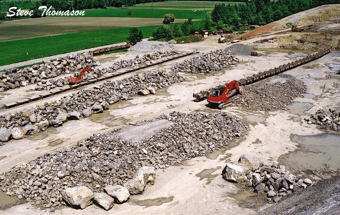 The railway crosses the Rhine in two places. The first bridge is just a couple of kilometers from the quarry, and once on the western bank, the railway is in Switzerland. Further north, there is a combined road/rail bridge, which takes the railway back into Austria. However, at this point, the railway extends north along both banks of the river, but when visited in May 2000, the construction work was only being carried out on the western bank.