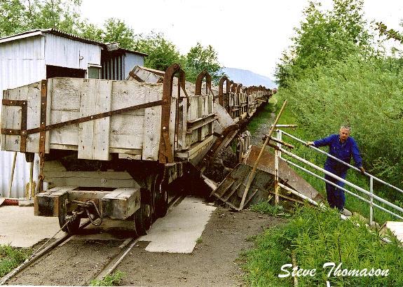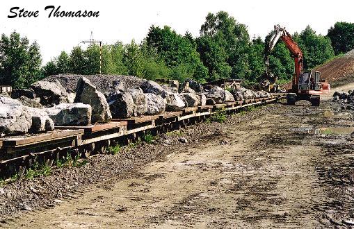As well as transporting stone in skips and wooden tippers, wooden flat wagons are used to transport large rocks, which are taken to the far end of the line, and unloaded by a crane and grab.