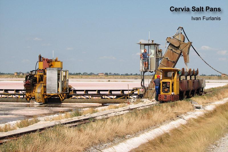 Saline Di Cervia (600mm gauge) The salt pans at Cervia in Italy are again making use of the 600mm gauge railway to harvest the salt. It apparently takes 2 weeks of railway activity to collect all the salt. On a visit in August, 4 of the 6 operational locos were working (Nos.2, 4, 5, and 6).There are 3 Greco and 3 Deutz locos, with a further 3 out of use. The previous time this railway was reported working on this site was in 2006, although it did work in 2007. Further photos from Ivan Furlanis can be found here. (Posted 30.08.09 Source: Ivan Furlanis) |