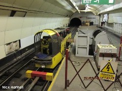 Post Office Railway (2ft) An underground visit was made to one of the old 'stations' on London's Post Office Railway. It was found that it is still managed on a care and maintenance basis, with at least one loco operational on an intermittent basis. It is used to check the tunnels. The electified lines are assumed not operational now so the motive power is by battery electric loco. (Posted 26.03.2012 Source: Nick Hartnell via Paul Stanford) |