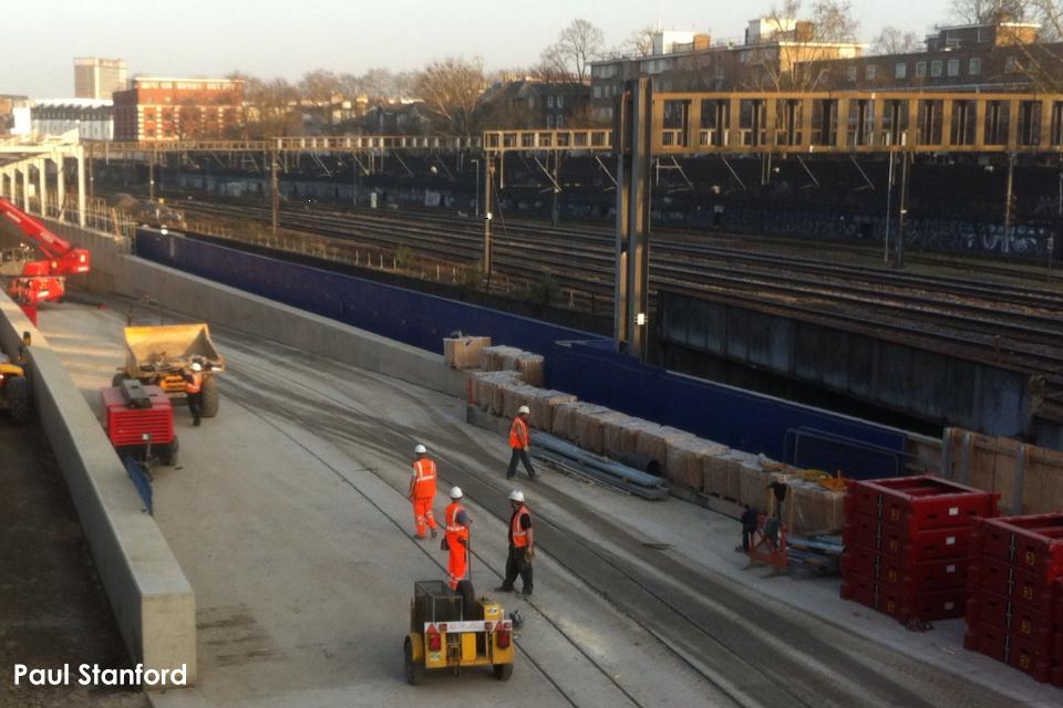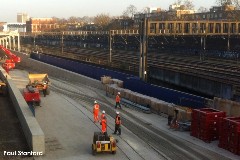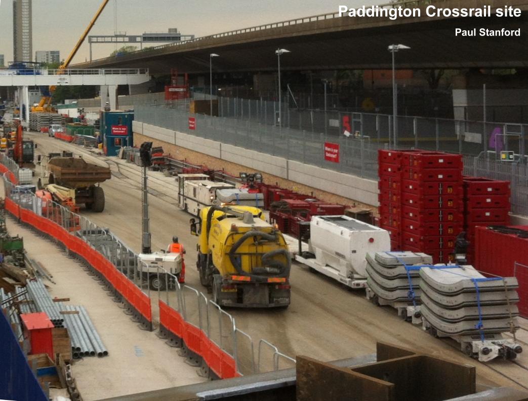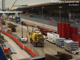 Corssrail site, Paddington (approx 2ft) At the end of February, the contractors started laying the railway to serve the tunnels on the London Crossrail project by Paddington. The gauge looked to be approx 2ft, but needs confirming. On Tuesday the 13th March the TBMs (Tunnel Boring Machines) were unveiled and by this time the narrow gauge tracks serving the tunnels were all in place and concreted in. There was no sign of locos or rolling stock. Due to the length of this project, this site could be in use for up to 18 months. Further photos of the operations and railway can be found on the London Connections website here. (Posted 26.03.2012 Source: Paul Stanford) |