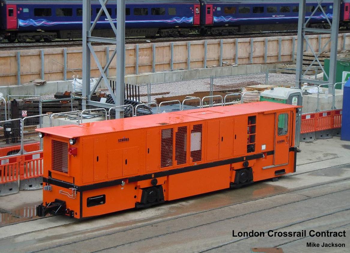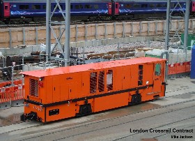 Crossrail site, Paddington (approx 2ft, confirmation required) By the 10th of May rolling stock and a loco (a white Schöma) had been delivered to the CrossRail site at Paddington. The photo below (on the 18th May) shows initial testing being carried out with a loaded train. It is reported that the tunnel boring machines started cutting on about the 8th May, and so the railway will have been required shortly after this date to move the concrete lining panels into place. By the 24th May a second loco had arrived on site, in orange livery. (Posted 09.06.2012 Source: Paul Stanford) |