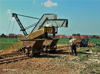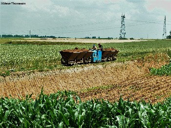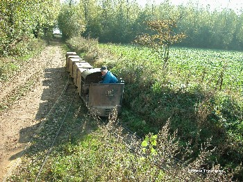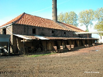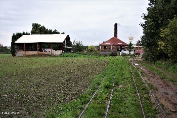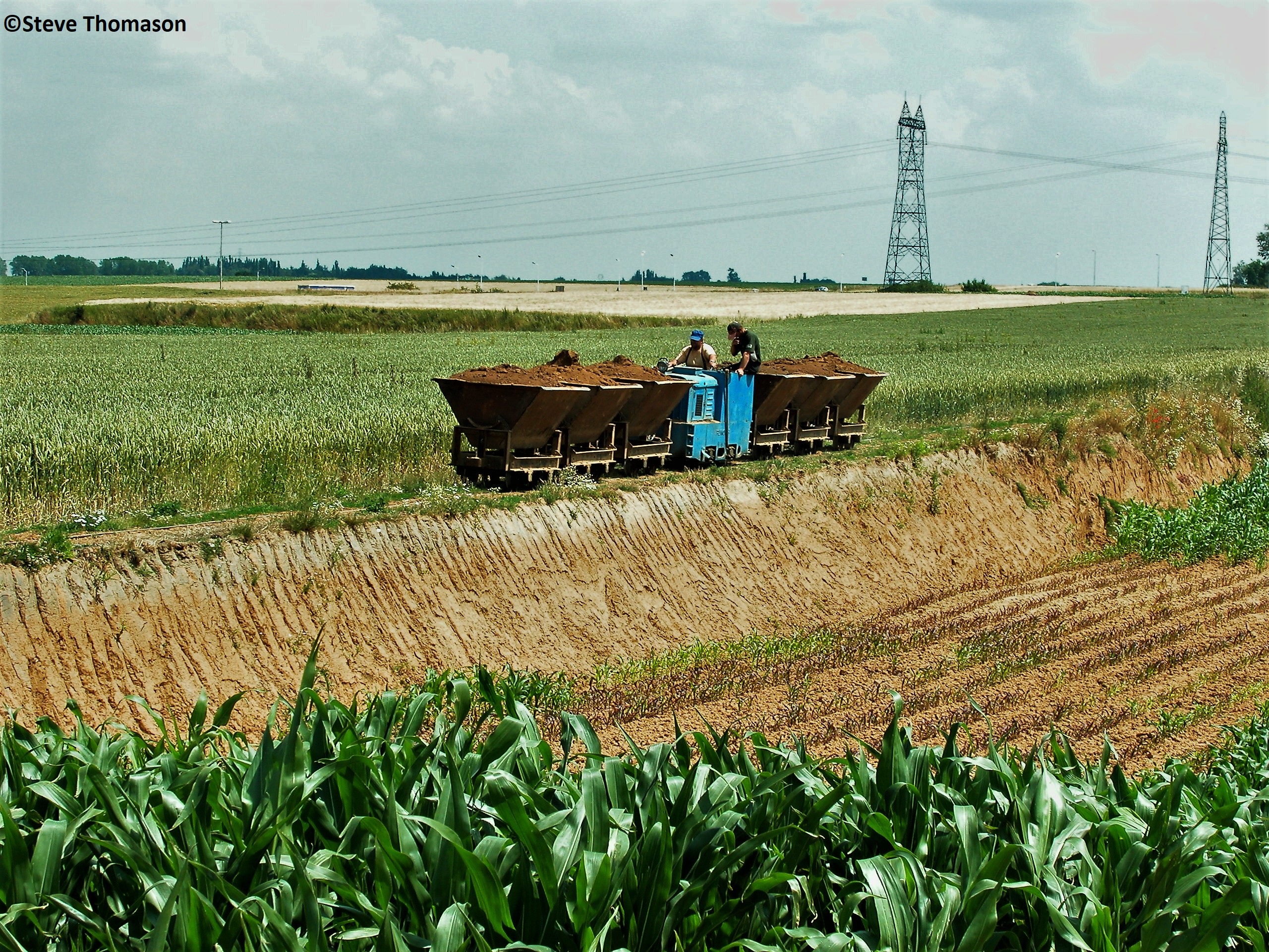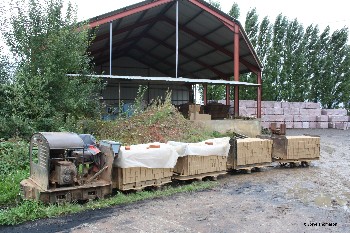 The 600mm gauge extension into the yard had been laid alongside the 500mm gauge line. The only place in France to see 2 loco worked narrow gauge lines of different gauges side by side. Sadly only a couple of years after these photos were taken, the use of the 600mm gauge line was stopped by 2017. A tractor and trailer being employed to transport clay from the pit. The 600mm gauge continues to be worked for a short time to deliver clay from the stockpile to the brick forming machines.