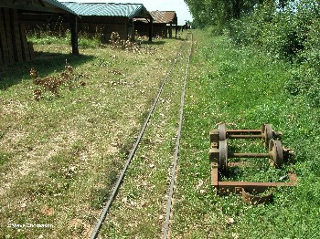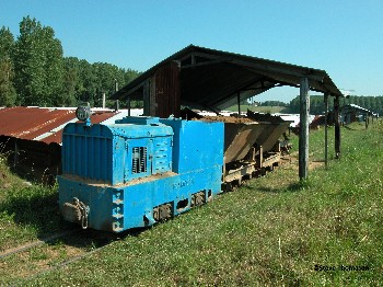 By 2015, the site was still using both railways, and in fact had extended the use of the 600mm gauge line right into the main yard to dump the clay in a newly built shed. Here the loaded train on the 500mm gauge line is due to leave for the drying sheds, and in the background the Plymouth and skips can just be seen under the shed.
