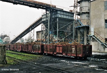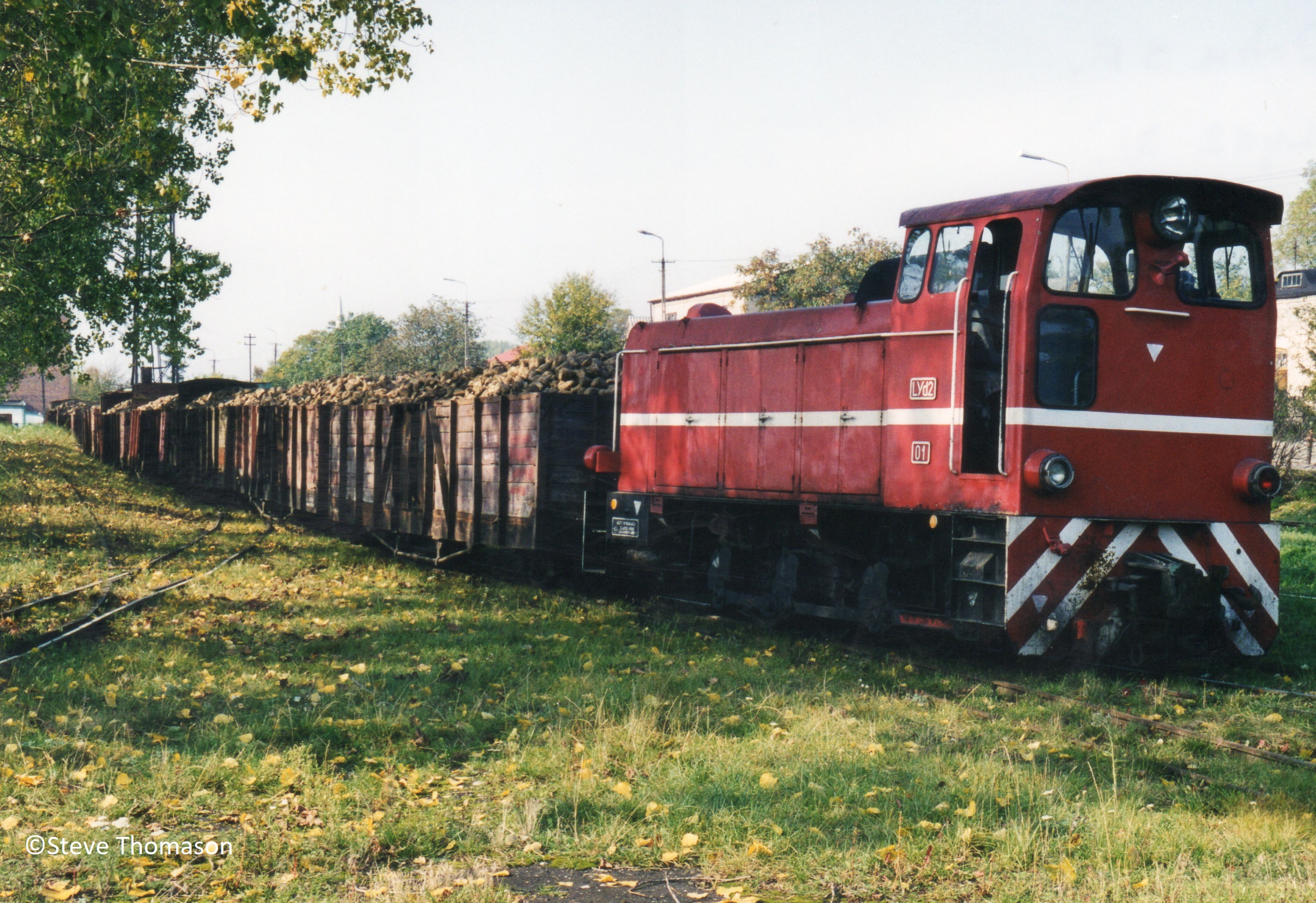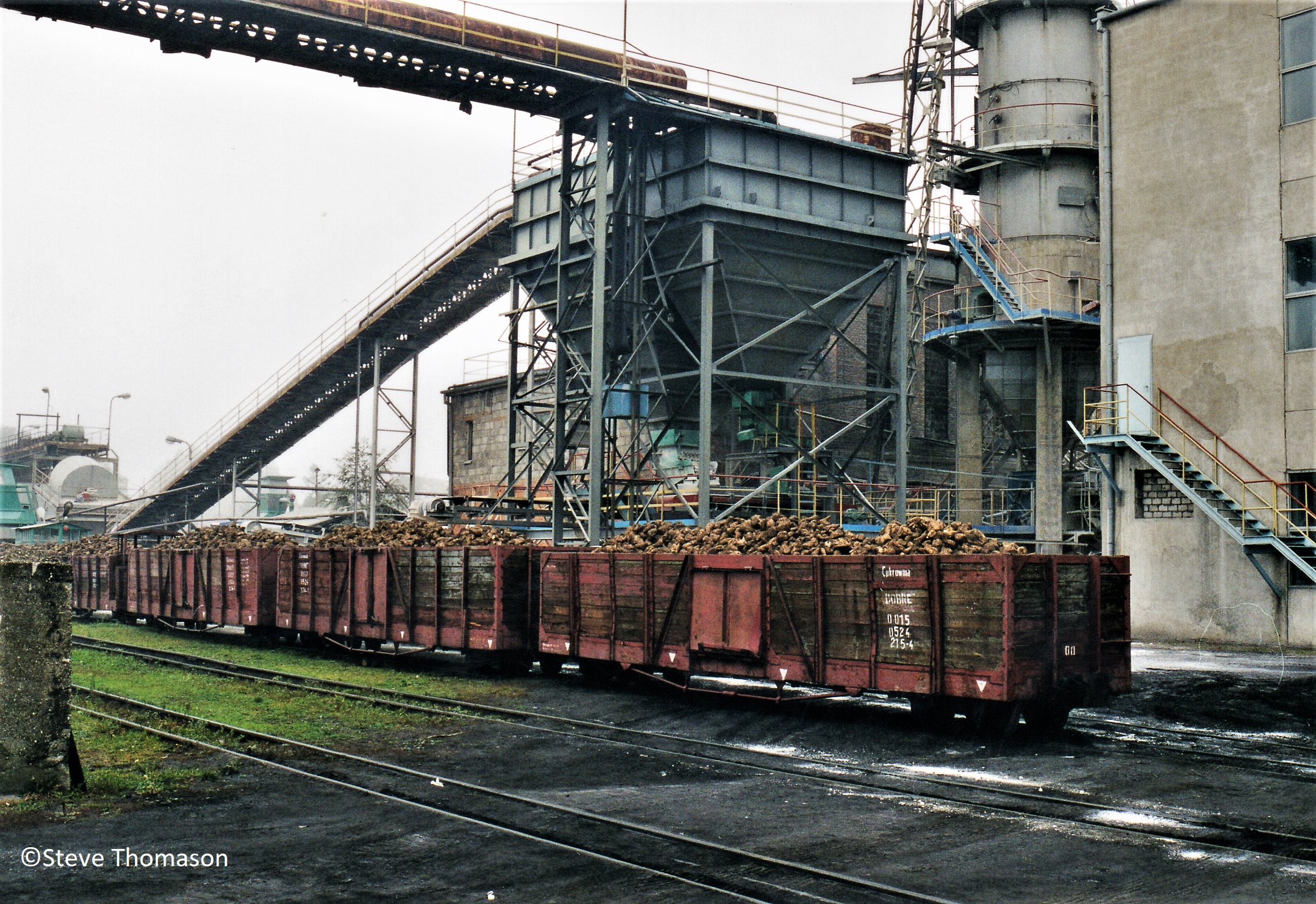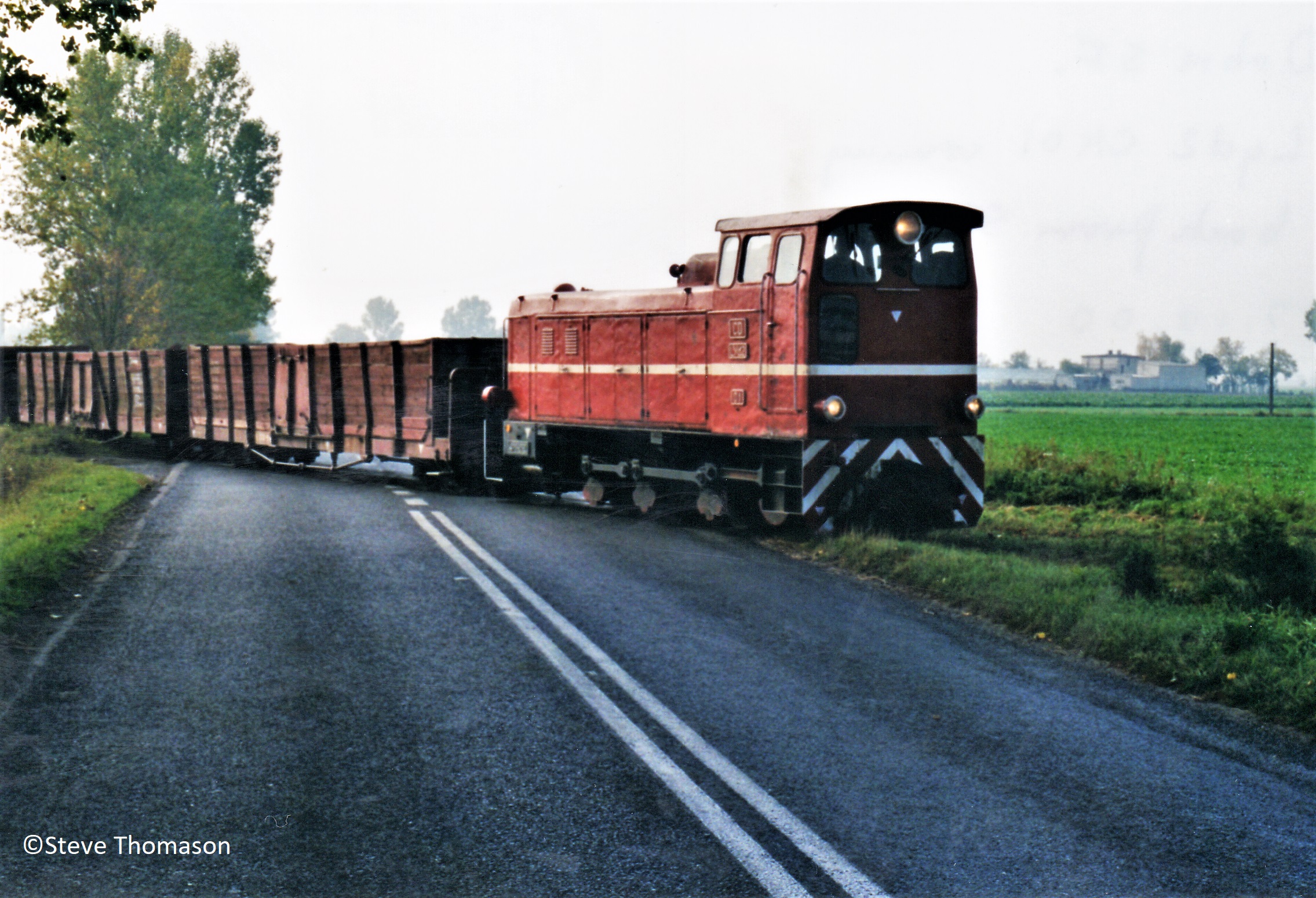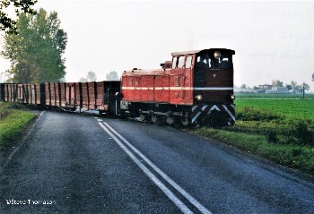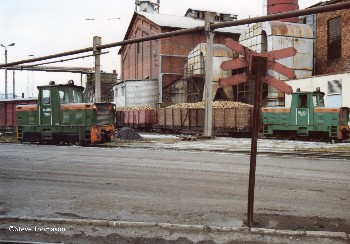 The same loco slowly pushing loaded wagons over the weighbridge just outside the sugar factory. |