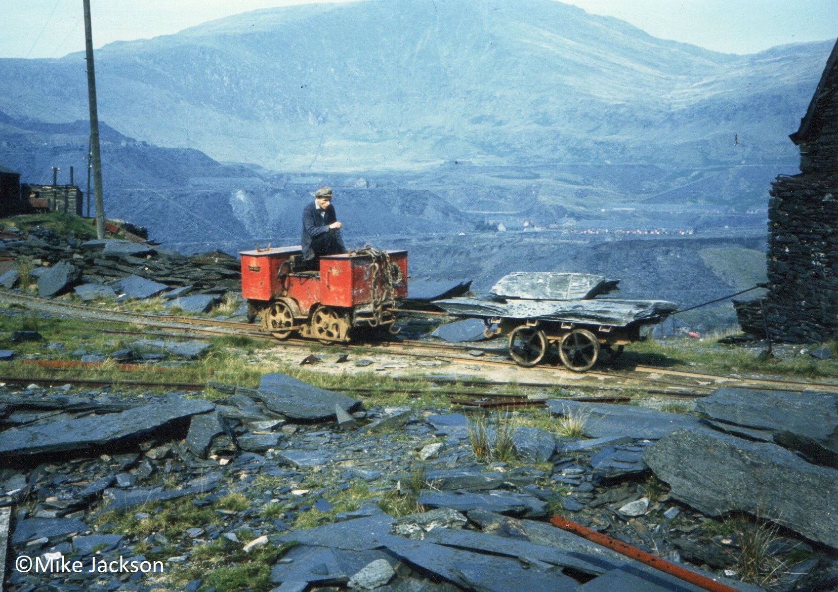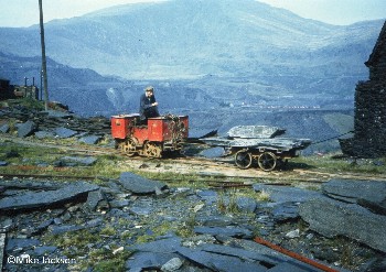 Taken back in 1967, a lovely bleak shot, with the slate waste heaps as a backdrop. An old BEV battery loco pushes a couple of slabs of uncut slate into Llechwedd mills.