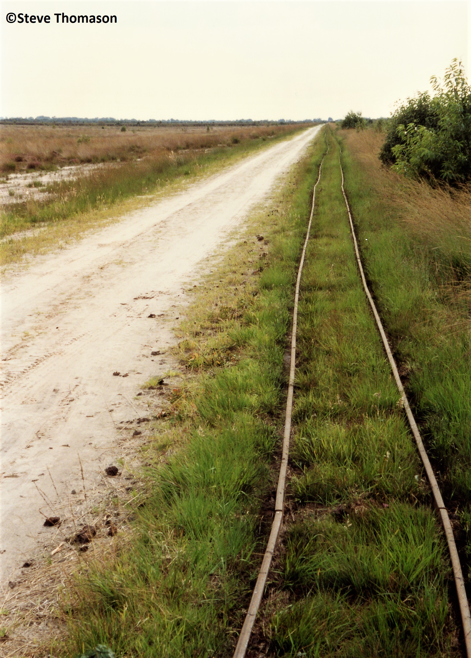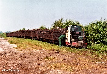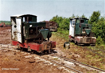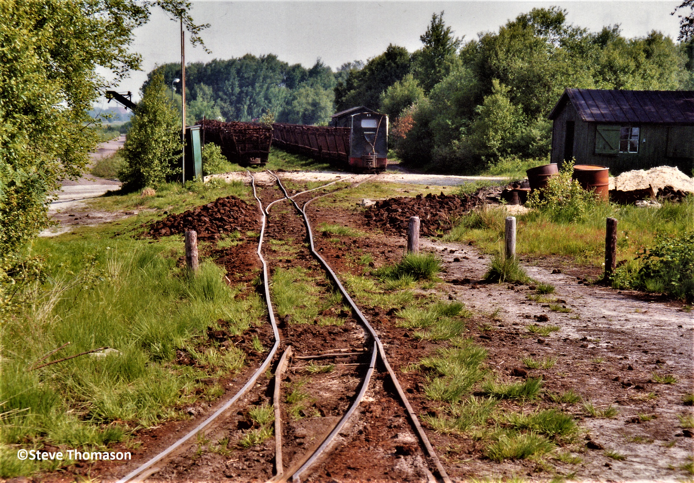 Usually there were two locos in use to shunt the loaded wagons up from the peat workings, because the track dropped down a considerable gradient onto the peat loading area. Here the two locos No2 and No3, have just hauled the loaded train onto the main line and await the arrival of the next set of empites.