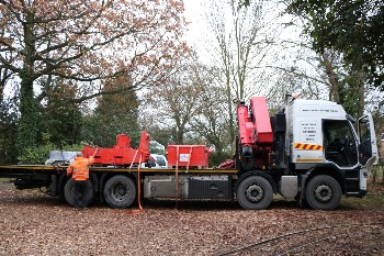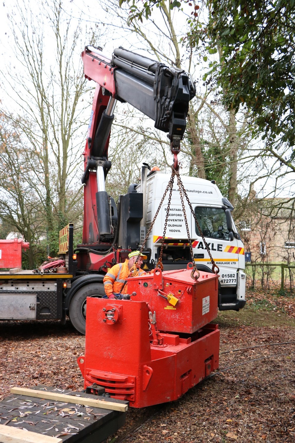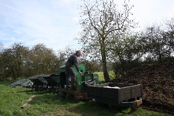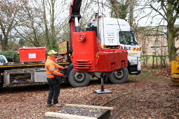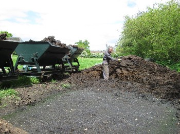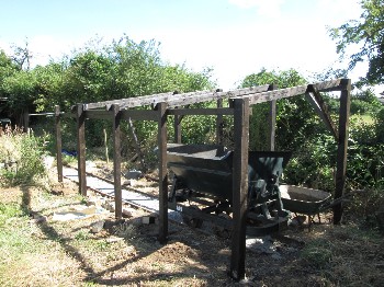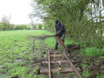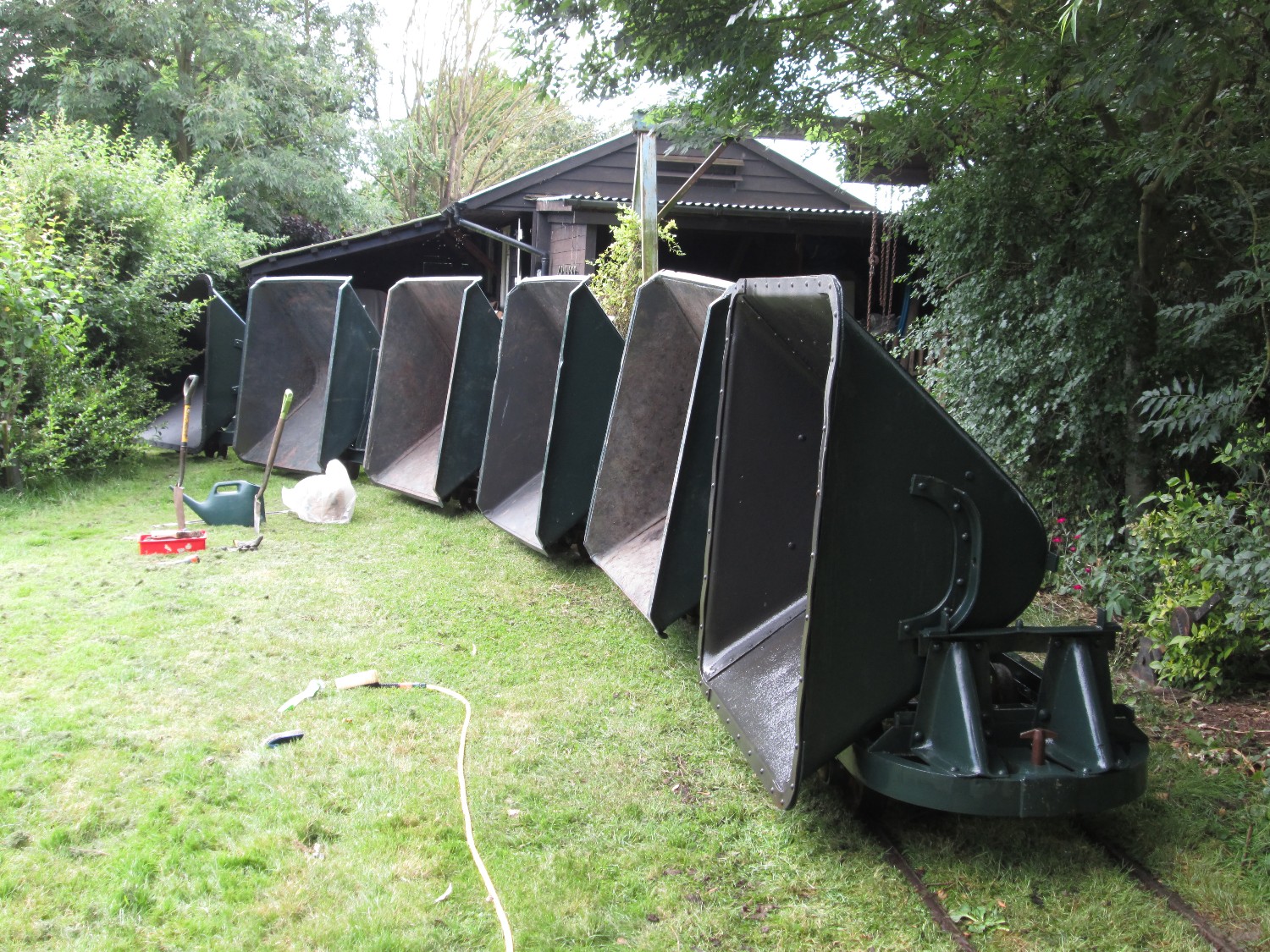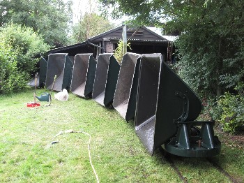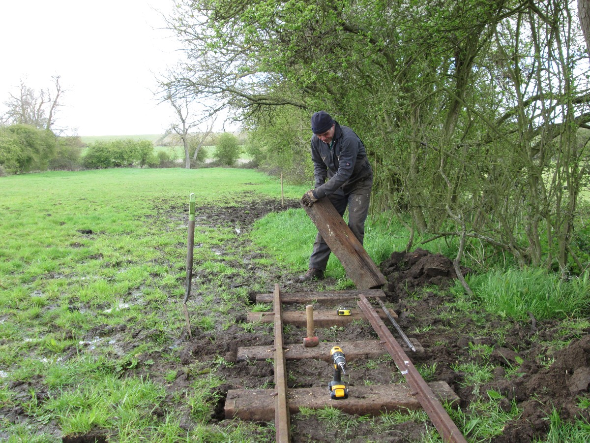 Using approx 7 sleepers per rail length each sleeper is droped in the surface aabout 3ft apart, dug in a few inches then checked with the level against the previous sleeper, so after digging in 7 sleepers the two rails can be dropped on top, hopefully with a minimum of adjustment before spiking down.