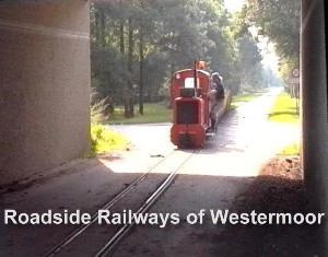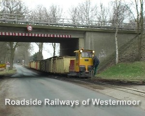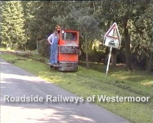 At Union Torfwerk the trains travelled down the centre of the road as it went under a road bridge near the works. Filmed in 1995. |
